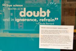 Steorn gave two public demonstrations of its technology. In the first demonstration, in July 2007 at the Kinetica Museum in London, the device failed to work.[8] The second demonstration, which ran from December 2009 to February 2010 at the Waterways Visitor Centre in Dublin, involved a motor powered by a battery and provided no independent evidence that excess energy was being generated.[9] It was dismissed by the press as an attempt to build a perpetual motion machine,[10] and a publicity stunt.[11]