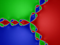 An example of Wada basins is given by the Newton fractal describing the basins of attraction of the Newton–Raphson method for finding the roots of a cubic polynomial with distinct roots, such as z3 − 1; see the picture.