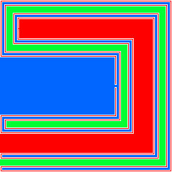 - Extend the blue lake by a channel of width 1/34 passing within √2/34 of all dry land. (The small channel connects the thin blue lake to the thick one, near the middle of the image.)