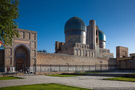 In Uzbekistan, numerous examples of Timurid architecture can be found in Samarkand, which was the capital of the Timurid Empire from its establishment in 1370 until it moved to Herat in the early 15th century. As it was the royal city, Timur often brought artisans back from defeated cities to build in Samarkand.[29] An example of Timurid Architecture in Samarkand is the Bibi-Khanym Mosque. The mosque was built between 1399 and 1404 in order to commemorate the wife of Timur, and was completed before Timur’s death in 1405.[3][30] At the time of construction, it was one of the largest mosques in the world and is still the largest in Samarkand.[31] As is consistent with other Timurid architecture, the mosque features glazed ceramic designs, a turquoise dome and geometric patterning of walls. Another notable example of Timurid architecture found in Samarkand is the Gur-e-Amir (or Gur-Emir) Mausoleum. Built in 1403 and 1404, the mausoleum is the tomb of Timur and his sons Shah Rukh and Miran Shah, along with other family members.[32] The mausoleum is decorated with blue and white tiles, as well as large mosaics. These are features of Timurid architecture and also exhibit Iranian influence.[29] The building also features a large Islamic-style dome and minarets that were refurbished in the 1950s.[32] Timur was born in Shahrisabz, an Uzbekistani city located roughly 50 miles South of Samarkand. In the city, Timur also constructed Aq Saray (White Palace) in 1380 after a victorious battle with Urgench.[33]:6[34] Despite only part of the original building remaining, Aq Saray also demonstrates being decorated by geometrically patterned glazed tiles, a feature found throughout Timurid Architecture.[34]