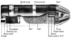 During World War II, Germany began an intensive program to research and develop a practical internal propellant caseless ammunition cartridge for military use, which was driven by the rising scarcity of metals, especially copper used to make cartridge cases. The Germans had some success, but not sufficient to produce a caseless cartridge system during the war.[6] One quasi-example which almost entered production was the 55 mm Maschinenkanone MK 155. It used partially combustible cartridges similar to the ones used in the popular Rheinmetall Rh-120 tank gun today. Japan, however, successfully developed an aircraft mounted autocannon using internal propellant caseless ammunition during the war. Named Ho-301, it was a 40 mm autocannon and saw limited action in the defense of the Japanese home islands during the waning months of the war.[3]