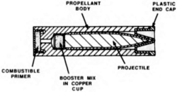 Older caseless ammunition typically uses a configuration where the primer and propellant get integrated into the bottom of the projectile, much like a rocket. When fired, the propellant gas is vented out the back of the projectile to accelerate it to speed. Unlike rocket projectiles, which have similar configurations, the propellant of "internal propellant caseless ammunition" has an instant burn time like a traditional cartridge (under 0.2 seconds),[4] meaning the propellant burns up before the projectile leaves the barrel, preferrably inside the chamber. Rocket projectiles, in comparison, have propellant burn times of over 0.2 seconds, usually several seconds, meaning rocket propellant traditionally propels the rocket for a certain distance from the launcher.[4]