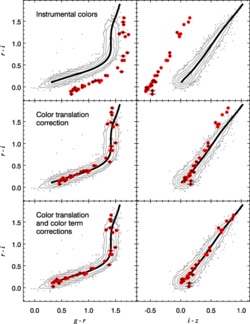 The color-color diagram of stars can be used to directly calibrate or to test colors and magnitudes in optical and infrared imaging data. Such methods take advantage of the fundamental distribution of stellar colors in our galaxy across the vast majority of the sky, and the fact that observed stellar colors (unlike apparent magnitudes) are independent of the distance to the stars. Stellar locus regression (SLR)[3] was a method developed to eliminate the need for standard star observations in photometric calibrations, except highly infrequently (once a year or less) to measure color terms. SLR has been used in a number of research initiatives. The NEWFIRM survey of the NOAO Deep Wide-Field Survey region used it to arrive at more accurate colors than would have otherwise been attainable by traditional calibration methods, and South Pole Telescope used SLR in the measurement of redshifts of galaxy clusters.[4] The blue-tip method[5] is closely related to SLR, but was used mainly to correct Galactic extinction predictions from IRAS data. Other surveys have used the stellar color-color diagram primarily as a calibration diagnostic tool, including The Oxford-Dartmouth Thirty Degree Survey[6] and Sloan Digital Sky Survey (SDSS).[7]