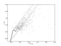 Color–color diagrams allow for these effects to be isolated. As the color–color relationships of main sequence stars are well known, a theoretical main sequence can be plotted for reference, as is done with the solid black line in the example to the right. Interstellar dust scattering is also well understood, allowing bands to be drawn on a color–color diagram defining the region in which stars reddened by interstellar dust are expected to be observed, indicated on the color–color diagram by dashed lines. The typical axes for infrared color–color diagrams have (H–K) on the horizontal axis and (J–H) on the vertical axis (see infrared astronomy for information on band color designations). On a diagram with these axes, stars which fall to the right of the main sequence and the reddening bands drawn are significantly brighter in the K band than main sequence stars, including main sequence stars which have experienced reddening due to interstellar dust. Of the J, H, and K bands, K is the longest wavelength, so objects which are anomalously bright in the K band are said to exhibit infrared excess. These objects are likely protostellar in nature, with the excess radiation at long wavelengths caused by suppression by the reflection nebula in which the protostars are embedded.[13] Color–color diagrams can be used then as a means of studying stellar formation, as the state of a star in its formation can be roughly determined by looking at its position on the diagram.[14]