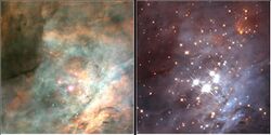 Color–color diagrams are often used in infrared astronomy to study star forming regions. Stars form in clouds of dust. As the star continues to contract, a circumstellar disk of dust is formed, and this dust is heated by the star inside. The dust itself then begins to radiate as a blackbody, though one much cooler than the star. As a result, an excess of infrared radiation is observed for the star. Even without circumstellar dust, regions undergoing star formation exhibit high infrared luminosities compared to stars on the main sequence.[12] Each of these effects is distinct from the reddening of starlight which occurs as a result of scattering off of dust in the interstellar medium.