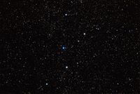 The other prominent open clusters in Cassiopeia are NGC 457 and NGC 663, both of which have about 80 stars. NGC 457 is looser, and its brightest member is Phi Cassiopeiae, a white-hued supergiant star of magnitude 5.0. However, it is uncertain whether Phi Cassiopeiae is part of the open cluster or not.[34] The stars of NGC 457, arrayed in chains, are approximately 10,000 light-years from Earth. NGC 663 is both closer, at 8200 light-years from Earth, and larger, at 0.25 degrees in diameter.[21]