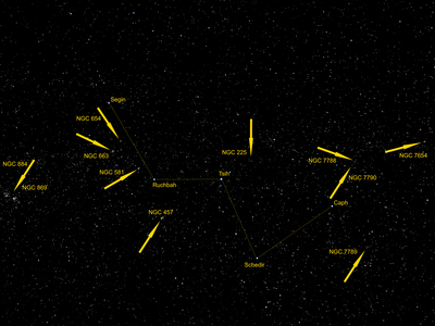 Cassiopeia with indication of χ Persei (NGC 884) and h Persei (NGC 869) as well as the star clusters NGC 654, NGC 663, NGC 581 (Messier 103), NGC 457, NGC 225, NGC 7788, NGC 7790, NGC 7789 and NGC 7654 (Messier 52).
