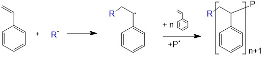 Synthetic methods are generally divided into two categories, step-growth polymerization and chain polymerization.[18] The essential difference between the two is that in chain polymerization, monomers are added to the chain one at a time only,[19] such as in polystyrene, whereas in step-growth polymerization chains of monomers may combine with one another directly,[20] such as in polyester. Step-growth polymerization can be divided into polycondensation, in which low-molar-mass by-product is formed in every reaction step, and polyaddition.