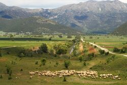 The peculiarity of the plains and basins is a result of intensive karstification: Water seeps into the underground, rather than eroding and draining the topography by surface waterways. All drainage runs through ponors (in Greek: καταβόθρες) and subterranean waterways.[4][5] The additional problem for rural activities in the basins: When winter rains are heavy, the ground is flooded or temporary lakes arise, even today, as drainage through katavothres is often too slow to start cultivation in due time.