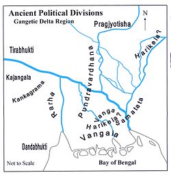 The term Bengali is generally used to refer to someone whose linguistic, cultural or ancestral origins are from Bengal. The Indo-Aryan Bengalis are ethnically differentiated from the non-Indo-Aryan tribes inhabiting Bengal. Their ethnonym, Bangali, along with the native name of the language and region Bangla, are both derived from Bangālah, the Persian word for the region. Prior to Muslim expansion, there was no unitary territory by this name as the region was instead divided into numerous geopolitical divisions. The most prominent of these were Vaṅga (from which Bangālah is thought to ultimately derive from) in the south, Rāṛha in the west, Puṇḍravardhana and Varendra in the north, and Samataṭa and Harikela in the east. In ancient times, the people of this region identified themselves with respect to these divisions. Vedic texts such as the Mahābhārata makes mention of the Puṇḍra people.