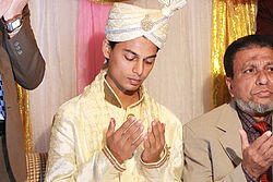 A marriage among Bengalis often consists of multiple events rather than just one wedding. Arranged marriages are arguably the most common form of marriage among Bengalis and are considered traditional in society.[127] Marriage is seen as a union between two families rather than just two people,[128][129] and they play a large part in developing and maintaining social ties between families and villages. The two families are facilitated by Ghotoks (mutual matchmakers), and the first event is known as the Paka Dekha/Dekhadekhi where all those involved are familiarised with each other over a meal at the bride's home. The first main event is the Paan-Chini/Chini-Paan, hosted by the bride's family. Gifts are received from the groom's family and the marriage date is fixed in this event.[130] An adda takes place between the families as they consume a traditional Bengali banquet of food, paan, tea and mishti. The next event is the mehndi (henna) evening also known as the gaye holud (turmeric on the body). This is normally followed by the main event, the walima, hosting thousands of guests. An aqd (vow) takes place, where a contract of marriage (Kabin nama) and is signed. A qazi or imam is usually present here and would also recite the Qur'an and make dua for the couple. The groom is required to pay mohor (dowry) to the bride. The Phirajatra/Phirakhaowa consists of the return of the bride with her husband to her home, which then becomes referred to as Naiyor, and payesh and milk are served. Other post-marriage ceremonies include the Bou Bhat which takes place in the groom's home.