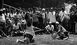 Lathi khela (stick-fighting) was historically a method of duelling as a way to protect or take land and others' possessions. The Zamindars of Bengal would hire lathials (trained stick-fighters) as a form of security and a means to forcefully collect tax from tenants.[147] Nationwide lathi khela competitions used to take place annually in Kushtia up until 1989, though its practice is now diminishing and being restricted to certain festivals and celebrations.[148] Chamdi is a variant of lathi khela popular in North Bengal. Kushti (wrestling) is also another popular fighting sport and it has developed regional forms such as boli khela, which was introduced in 1889 by Zamindar Qadir Bakhsh of Chittagong. A merchant known as Abdul Jabbar Saodagar adapted the sport in 1907 with the intention of cultivating a sport that would prepare Bengalis in fighting against British colonials.[149][150] In 1972, a popular contact team sport called Kabadi was made the national sport of Bangladesh. It is a regulated version of the rural Hadudu sport which had no fixed rules. The Amateur Kabaddi Federation of Bangladesh was formed in 1973.[151] Butthan, a 20th-century Bengali martial arts invented by Grandmaster Mak Yuree, is now practised in different parts of the world under the International Butthan Federation.[152]