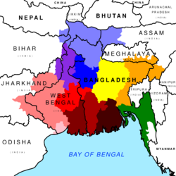 listen)), also rendered as Bangalee,[15][16] are an Indo-Aryan ethnolinguistic group originating from and culturally affiliated with the Bengal region of South Asia. The current population is divided between the sovereign country Bangladesh and the Indian states of West Bengal and Tripura, Barak Valley, Andaman and Nicobar Islands, Jharkhand and part of Meghalaya and Manipur.[17] Most of them speak Bengali, a language from the Indo-Aryan language family.