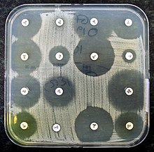 Antimicrobial susceptibility testing: Thin paper discs containing an antibiotic have been placed on an agar plate growing bacteria. Bacteria are not able to grow around antibiotics to which they are sensitive.
