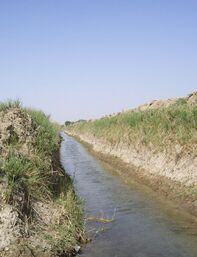 The water for irrigation was brought to the fields by canals.[10] The largest of these were fed directly from the rivers and supplied water to smaller canals which supplied yet smaller channels, all the way down to small irrigation ditches. The system could also include raised canals and sometimes aqueducts, if the terrain required them. Some regulating mechanisms were in place to control the flow and the level of the water, such as closeable basins. The sediment carried in the rivers meant that their beds were higher than the fields on the floodplain, so the water could be brought to the fields using gravity alone, once a ditch had been cut in the side of the riverbank.[11][12] However, mechanisms for raising water, like the shadoof and the noria, were in use from the first millennium BC. In some regions irrigation could also be effected from wells.