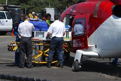 Respiratory therapists work with nurses, physicians, and paramedics in emergency flight and ground transport.[56][57] They are a vital practitioner delivering care inside helicopters, air ambulance or ground ambulance working to pick up a patient and move them to a facility that has what they need. In the United States certification for transport (C-NPT) is currently awarded by The National Certification Corporation.[58]