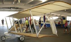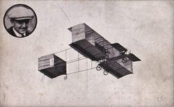 The stacking of wing planes was suggested by Sir George Cayley in 1843.[21] Hiram Maxim adopted the idea for his steam-powered test rig, which lifted off but was held down by safety rails, in 1894.[22] Otto Lilienthal designed and flew two different biplane hang gliders in 1895,[23] though he is better known for his monoplanes.[24] By 1896 a group of young men in the United States, led by Octave Chanute, were flying hang gliders including biplanes and concluded that the externally braced biplane offered better prospects for powered flight than the monoplane. In 1903, the Wright Flyer biplane became the first successful powered aeroplane.[25]
