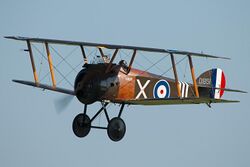 The larger two-seat Curtiss JN-4 Jenny is a two bay biplane, the extra bay being necessary as overlong bays are prone to flexing and can fail. The SPAD S.XIII fighter, while appearing to be a two bay biplane, has only one bay, but has the midpoints of the rigging braced with additional struts; however, these are not structurally contiguous from top to bottom wing.[6] The Sopwith 1½ Strutter has a W shape cabane, however as it does not connect the wings to each other, it does not add to the number of bays.[7]