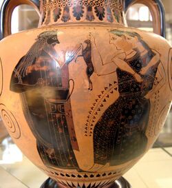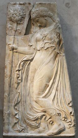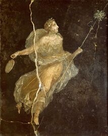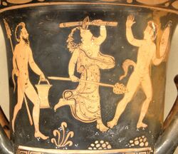 According to Plutarch's Life of Alexander, maenads were called Mimallones and Klodones in Macedon, epithets derived from the feminine art of spinning wool.[5] Nevertheless, these warlike parthenoi ("virgins") from the hills, associated with a Dionysios pseudanor ("fake male Dionysus"), routed an invading enemy.[6] In southern Greece they were described as Bacchae, Bassarides, Thyiades, Potniades,[7][better source needed] and other epithets.[8]