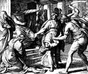 The women are not explicitly condemned for their occupation,[46] and some think that the narrator does not intend to discredit them for being prostitutes, and their conduct should be judged against universal human standards.[47] On the other hand, Phyllis Bird thinks that the story presupposes the stereotypical biblical image of the prostitute as a selfish liar. The true mother is revealed when her motherly essence – which is also stereotypical – surpasses her selfish essence.[48] Athalya Brenner notes that both women's maternal instinct is intact: For the true mother it is manifested, as mentioned, in the compassion and devotion that she shows for her son; and for the impostor it is manifested in her desire for a son, which makes her steal the other mother's son when her own son dies. According to Brenner, one of the lessons of the story is that "true maternal feelings ... may exist even in the bosom of the lowliest woman".[49]