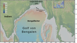 It is located in the Bay of Bengal, being about 3,000 km (1,900 mi) long, 1,430 km (890 mi) wide with a maximum thickness of 16.5 km (10.3 mi).[1] The fan resulted from the uplift and erosion of the Himalayas and the Tibetan Plateau produced by the collision between the Indian Plate and the Eurasian Plate. Most of the sediment is supplied by the Ganges and Brahmaputra rivers which supply the Lower Meghna delta in Bangladesh and the Hoogly delta in West Bengal (India). Several other large rivers in Bangladesh and India provide smaller contributions.[2] Turbidity currents have transported the sediment through a series of submarine canyons, some of which are more than 1,500 miles (2,414 km) in length, to be deposited in the Bay of Bengal up to 30 degrees latitude from where it began. To date, the oldest sediments recovered from the Bengal fan are from Early Miocene age.[3] Their mineralogical and geochemical characteristics allow to identify their Himalayan origin and demonstrate that the Himalaya was already a major mountain range 20 million years ago.[4]