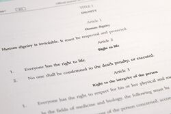 Capital punishment is controversial, with many people, organizations, and religious groups holding differing views on whether or not it is ethically permissible. Amnesty International declares that the death penalty breaches human rights, stating "the right to life and the right to live free from torture or cruel, inhuman or degrading treatment or punishment."[13] These rights are protected under the Universal Declaration of Human Rights, adopted by the United Nations in 1948.[13] In the European Union (EU), Article 2 of the Charter of Fundamental Rights of the European Union prohibits the use of capital punishment.[14] The Council of Europe, which has 46 member states, has sought to abolish the use of the death penalty by its members absolutely, through Protocol 13 of the European Convention on Human Rights. However, this only affects those member states which have signed and ratified it, and they do not include Armenia and Azerbaijan. The United Nations General Assembly has adopted, throughout the years from 2007 to 2020,[15] eight non-binding resolutions calling for a global moratorium on executions, with a view to eventual abolition.[16]