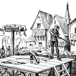 Execution of criminals and dissidents has been used by nearly all societies since the beginning of civilizations on Earth.[17] Until the nineteenth century, without developed prison systems, there was frequently no workable alternative to ensure deterrence and incapacitation of criminals.[18] In pre-modern times the executions themselves often involved torture with cruel and painful methods, such as the breaking wheel, keelhauling, sawing, hanging, drawing, and quartering, burning at the stake, flaying, slow slicing, boiling alive, impalement, mazzatello, blowing from a gun, schwedentrunk, and scaphism. Other methods which appear only in legend include the blood eagle and brazen bull.