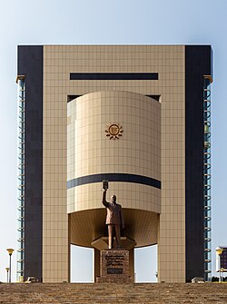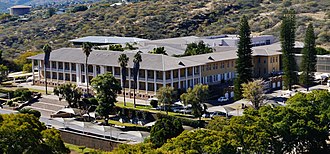 The city is the administrative, commercial, and industrial centre of Namibia. A 1992/93 study estimated that Windhoek provides over half of Namibia's non-agricultural employment, with its national share of employment in utilities being 96%, in transport and communication 94%, finance and business services 82%.[19] Due to its relative size[20] Windhoek is, even more than many other national capital cities, the social, economic, and cultural centre of the country. The University of Namibia is based in the city, as well as nearly every national enterprise, including the country's only theatre, all ministry head offices, and all major media and financial entities.[21] The governmental budget of the city of Windhoek nearly equals those of all other Namibian local authorities combined.[22] Of the 3,300 US$-millionaires in Namibia, 1,400 live in Windhoek.[23]