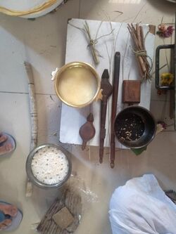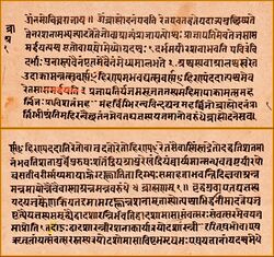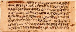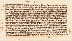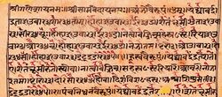 The Brahmanas are particularly noted for their instructions on the proper performance of rituals, as well as explanations on the symbolic importance of sacred words and ritual actions.[17] Academics such as P. Alper, K. Klostermaier and F.M, Muller state that these instructions insist on exact pronunciation (accent),[18] chhandas (छन्दः, meters), precise pitch, with coordinated movement of hand and fingers – that is, perfect delivery.[19][20] Klostermaier adds that the Satapatha Brahamana, for example, states that verbal perfection made a mantra infallible, while one mistake made it powerless.[19] Scholars suggest that this orthological perfection preserved Vedas in an age when writing technology was not in vogue, and the voluminous collection of Vedic knowledge were taught to and memorized by dedicated students through Svādhyāya, then remembered and verbally transmitted from one generation to the next.[19][21] It seems breaking silence too early in at least one ritual is permissible in the Satapatha (1.1.4.9), where 'in that case mutter some Rik [Rigveda] or Yagus-text [Yajurveda] addressed to Vishnu; for Vishnu is the sacrifice, so that he thereby regains obtains a hold on the sacrifice, and penance is there by done by him'.[22]