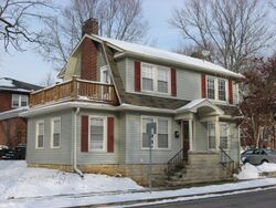 When Muller returned to the United States in 1940, he took an untenured research position at Amherst College, in the department of Otto C. Glaser. After the U.S. entry into World War II, his position was extended indefinitely and expanded to include teaching. His Drosophila work in this period focused on measuring the rate of spontaneous (as opposed to radiation-induced) mutations. Muller's publication rate decreased greatly in this period, from a combination of lack of lab workers and experimentally challenging projects. However, he also worked as an adviser in the Manhattan Project (though he did not know that was what it was), as well as a study of the mutational effects of radar. Muller's appointment was ended after the 1944–1945 academic year, and despite difficulties stemming from his socialist political activities, he found a position as professor of zoology at Indiana University.[25] Here, he lived in a Dutch Colonial Revival house in Bloomington's Vinegar Hill neighborhood.[26]