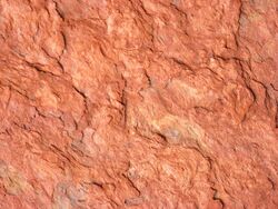 Uluru is dominantly composed of coarse-grained arkose (a type of sandstone characterised by an abundance of feldspar) and some conglomerate.[45][50] Average composition is 50% feldspar, 25–35% quartz and up to 25% rock fragments; most feldspar is K-feldspar with only minor plagioclase as subrounded grains and highly altered inclusions within K-feldspar.[45] The grains are typically 2–4 mm (0.079–0.157 in) in diameter, and are angular to subangular; the finer sandstone is well sorted, with sorting decreasing with increasing grain size.[45] The rock fragments include subrounded basalt, invariably replaced to various degrees by chlorite and epidote.[45] The minerals present suggest derivation from a predominantly granite source, similar to the Musgrave Block exposed to the south.[49] When relatively fresh, the rock has a grey colour, but weathering of iron-bearing minerals by the process of oxidation gives the outer surface layer of rock a red-brown rusty colour.[45] Features related to deposition of the sediment include cross-bedding and ripples, analysis of which indicated deposition from broad shallow high energy fluvial channels and sheet flooding, typical of alluvial fans.[45][49]