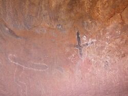 One of the major stories associated with Uluru is the Mala story. In this, the Mala (rufous hare-wallaby) people came from the north, and decided to stay at Uluru for a while, and perform the ceremony known as inma. The men decorated and raised the ceremonial pole (Ngaltawata) and began inma, while the women gathered and prepared bush food, storing seed cakes (nyuma) in their caves. The men hunted, made fires, and fixed their tools and weapons. Two Wintalka men approached from the west, and invited the Mala people to attend their inma, but the Mala people declined the invitation, as their inma had begun and could not be stopped. The Wintalka men went back and told their people, who got angry and created an evil spirit, in the form of an enormous devil-dog called Kurpany, in order to wreck the Mala inma. Kurpany approached the Mala people, changing form as he did so, including taking the form of a ghost (mamu). Luunpa (the kingfisher woman) spied him first, and warned the Mala people; however, they did not listen to her. Kurpany attacked and killed some of the men, and the remaining Mala people fled southwards, into what is now the state of South Australia, with Kurpany in pursuit. This story continues among the Indigenous peoples of South Australia.[55]