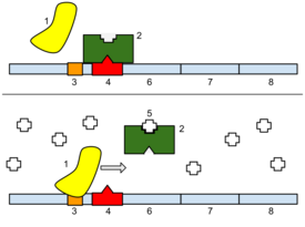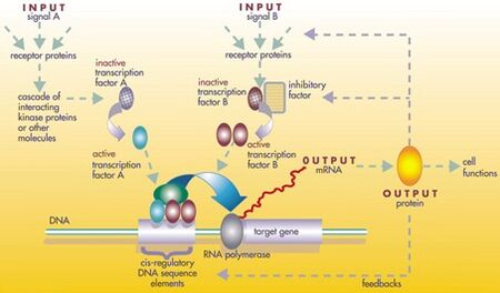 The protein products of the regulatory toolkit are reused not by duplication and modification, but by a complex mosaic of pleiotropy, being applied unchanged in many independent developmental processes, giving pattern to many dissimilar body structures.[20] The loci of these pleiotropic toolkit genes have large, complicated and modular cis-regulatory elements. For example, while a non-pleiotropic rhodopsin gene in the fruit fly has a cis-regulatory element just a few hundred base pairs long, the pleiotropic eyeless cis-regulatory region contains 6 cis-regulatory elements in over 7000 base pairs.[20] The regulatory networks involved are often very large. Each regulatory protein controls "scores to hundreds" of cis-regulatory elements. For instance, 67 fruit fly transcription factors controlled on average 124 target genes each.[20] All this complexity enables genes involved in the development of the embryo to be switched on and off at exactly the right times and in exactly the right places. Some of these genes are structural, directly forming enzymes, tissues and organs of the embryo. But many others are themselves regulatory genes, so what is switched on is often a precisely-timed cascade of switching, involving turning on one developmental process after another in the developing embryo.[20]