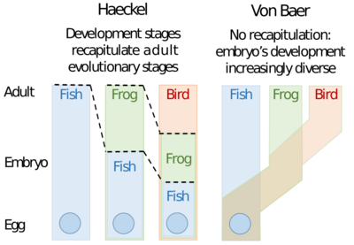 A recapitulation theory of evolutionary development was proposed by Étienne Serres in 1824–26, echoing the 1808 ideas of Johann Friedrich Meckel. They argued that the embryos of 'higher' animals went through or recapitulated a series of stages, each of which resembled an animal lower down the great chain of being. For example, the brain of a human embryo looked first like that of a fish, then in turn like that of a reptile, bird, and mammal before becoming clearly human. The embryologist Karl Ernst von Baer opposed this, arguing in 1828 that there was no linear sequence as in the great chain of being, based on a single body plan, but a process of epigenesis in which structures differentiate. Von Baer instead recognized four distinct animal body plans: radiate, like starfish; molluscan, like clams; articulate, like lobsters; and vertebrate, like fish. Zoologists then largely abandoned recapitulation, though Ernst Haeckel revived it in 1866.[3][4][5][6][7]