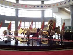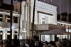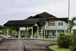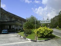 Istana Darussalam[lower-alpha 3] is a former royal residence of Sultan Omar Ali Saifuddien III, as well as the birthplace of Sultan Hassanal Bolkiah.[37] It was built in the 1940s and located at Sumbiling Lama, an area on the banks of Kedayan River near the city centre.[37] The building is made of wood and styled in traditional Malay stilt house. It has been designated as a protected monument under the Antiquities and Treasure Trove Act.[38] The palace has also been designated as a tourist attraction,[38] although the compound within the gate and the building is not open to the public. The road that leads to the palace has been named after it.[lower-alpha 4][37]