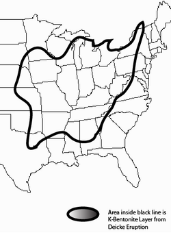 Several different types of bentonite can be found; however, potassium bentonite is the main one associated with the Deicke and Millbrig eruptions. The Deicke and Millbrig K-bentonite layers can be found from Alabama to New York to Minnesota. These K-bentonite layers are up to a meter thick in some locations.[8] Such thickness is unique. Most bentonite layers are very thin (only a few centimeters thick). Localities where the bentonite thickness and grain size are at their maximum are most likely close to the eruption sites.[9]