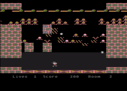 The third type of room is where the majority of the game time takes place. Here the player walks back and forth along the bottom while firing his plasmar detonators upward into the room. At the top of the room are alternating layers of enemies travelling horizontally, which can be attacked with the detonators. Periodically, waves of these enemies leave the horizontal rows and descend into the center of the room, where they are much easier to attack, but can also fire back at Shamus, or collide with him. The detonators are not used up when they hit an enemy, and continue to bounce around the screen like small rubber balls. If these make it to the top, they can get above the rows of enemies and bounce repeatedly, as in the game Breakout.[4]