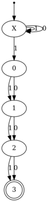 In contrast, the string "10" is rejected by [math]\displaystyle{ M }[/math] (all possible state sequences for that input are shown in the upper right picture), since there is no way to reach the only accepting state, [math]\displaystyle{ q }[/math], by reading the final 0 symbol. While [math]\displaystyle{ q }[/math] can be reached after consuming the initial "1", this does not mean that the input "10" is accepted; rather, it means that an input string "1" would be accepted.