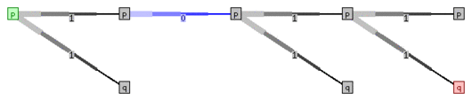 - Concerning the second formal definition, bottom-up computation shows that [math]\displaystyle{ \delta^*(p,\epsilon) = \{ p \} }[/math], hence [math]\displaystyle{ \delta^*(p,1) = \delta(p,1) = \{ p,q \} }[/math], hence [math]\displaystyle{ \delta^*(p,10) = \delta(p,0) \cup \delta(q,0) = \{ p \} \cup \{\} }[/math], hence [math]\displaystyle{ \delta^*(p,101) = \delta(p,1) = \{ p,q \} }[/math], and hence [math]\displaystyle{ \delta^*(p,1011) = \delta(p,1) \cup \delta(q,1) = \{ p,q \} \cup \{\} }[/math]; since that set is not disjoint from [math]\displaystyle{ \{ q \} }[/math], the string "1011" is accepted.