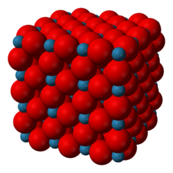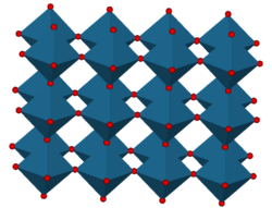 Rhenium trioxide crystallizes with a primitive cubic unit cell, with a lattice parameter of 3.742 Å (374.2 pm). The structure of ReO3 is similar to that of perovskite (ABO3), without the large A cation at the centre of the unit cell. Each rhenium center is surrounded by an octahedron defined by six oxygen centers. These octahedra share corners to form the 3-dimensional structure. The coordination number of O is 2, because each oxygen atom has 2 neighbouring Re atoms.[3]