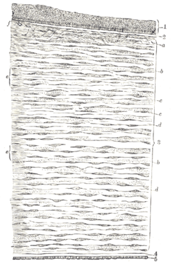 Vertical section of human cornea from near the margin. (Waldeyer.) Magnified. 1: Epithelium. 2: Anterior elastic lamina. 3: substantia propria. 4: Posterior elastic lamina (Descemet's membrane). 5: Endothelium of the anterior chamber. a: Oblique fibers in the anterior layer of the substantia propria. b: Lamellae, the fibers of which are cut across, producing a dotted appearance. c: Corneal corpuscles appearing fusiform in section. d: Lamellae, the fibers of which are cut longitudinally. e: Transition to the sclera, with more distinct fibrillation, and surmounted by a thicker epithelium. f: Small blood vessels cut across near the margin of the cornea.