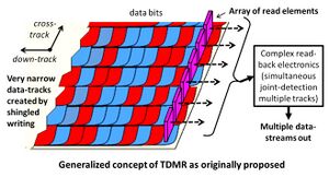 The TDMR approach arose from a working group set up under INSIC to explore alternative future storage technologies.[5][6] In the initial concept, the data-tracks were assumed to be very narrow tracks created by shingled recording and subject to considerable mutual interference. The read-heads were assumed to be each centered over a corresponding data-track and a joint detector would optimally recover data from several tracks simultaneously.[7][8] The technique was viewed as akin to PRML in providing gains similar to and in addition to the gains from PRML but operating across the tracks rather than down the track. A relatively large body of subsequent work has explored this configuration primarily from the perspective of signal processing.[9][10][11][12][13] However, the technical challenge of creating an array of closely spaced read-heads and the complexity of jointly detecting data simultaneously on several tracks are both considerable.
