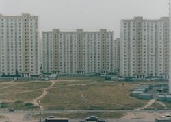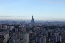 Pyongyang, the capital of North Korea, has a downtown consisting of hundreds of high-rise apartments; however, most residents live in one-story buildings. North Korean citizens are provided housing by the government, and the quality of said housing is dependent on social status and household size.[5] The city also has several extraordinarily expansive public spaces that are usually built around colossal monuments depicting Juche ideologies and/or monuments relating to Kim Jong-il.