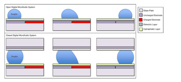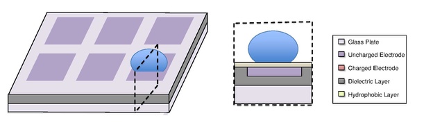 A digital microfluidic (DMF) device set-up depends on the substrates used, the electrodes, the configuration of those electrodes, the use of a dielectric material, the thickness of that dielectric material, the hydrophobic layers, and the applied voltage.[4][5]