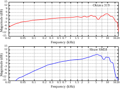 A microphone's directionality or polar pattern indicates how sensitive it is to sounds arriving at different angles about its central axis. The polar patterns illustrated above represent the locus of points that produce the same signal level output in the microphone if a given sound pressure level (SPL) is generated from that point. How the physical body of the microphone is oriented relative to the diagrams depends on the microphone design. For large-membrane microphones such as in the Oktava (pictured above), the upward direction in the polar diagram is usually perpendicular to the microphone body, commonly known as "side fire" or "side address". For small diaphragm microphones such as the Shure (also pictured above), it usually extends from the axis of the microphone commonly known as "end fire" or "top/end address".