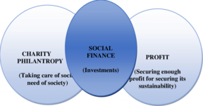 Efforts to create mechanisms to allocate capital for combined social and economic value creation are not new.[5][23] Social finance is conceptually a very different approach to social welfare enhancement, however, in that, by combining the ideas of neoliberal markets (in creating a profit and financial return) with taking care of the social need of society (in the way that a charity would), social finance secures its own sustainability by being profitable for those who fund these organisations.[7] It is funded by investors, who receive return on their investment, rather than donors, who forgo their contribution at the time of donation.[9] The ‘blended’ social and financial returns are a defining characteristic of social finance and distinguish it from related practices such as not-for-profit investing, charity and philanthropy.[9]