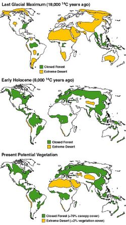 While a number of human-derived factors are recognized as contributing to rising atmospheric concentrations of CH4 (methane) and CO2 (carbon dioxide), deforestation and territorial clearance practices associated with agricultural development may have contributed most to these concentrations globally in earlier millennia.[126][136][144] Scientists that are employing a variance of archaeological and paleoecological data argue that the processes contributing to substantial human modification of the environment spanned many thousands of years on a global scale and thus, not originating as late as the Industrial Revolution. Palaeoclimatologist William Ruddiman has argued that in the early Holocene 11,000 years ago, atmospheric carbon dioxide and methane levels fluctuated in a pattern which was different from the Pleistocene epoch before it.[120][142][144] He argued that the patterns of the significant decline of CO2 levels during the last ice age of the Pleistocene inversely correlate to the Holocene where there have been dramatic increases of CO2 around 8000 years ago and CH4 levels 3000 years after that.[144] The correlation between the decrease of CO2 in the Pleistocene and the increase of it during the Holocene implies that the causation of this spark of greenhouse gases into the atmosphere was the growth of human agriculture during the Holocene.[120][144]