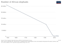 The surge in the mass killings by poachers involved in the illegal ivory trade along with habitat loss is threatening African elephant populations.[238][239] In 1979, their populations stood at 1.7 million; at present there are fewer than 400,000 remaining.[240] Prior to European colonization, scientists believe Africa was home to roughly 20 million elephants.[241] According to the Great Elephant Census, 30% of African elephants (or 144,000 individuals) disappeared over a seven-year period, 2007 to 2014.[239][242] African elephants could become extinct by 2035 if poaching rates continue.[185]