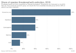 A June 2020 study published in PNAS posits that the contemporary extinction crisis "may be the most serious environmental threat to the persistence of civilization, because it is irreversible" and that its acceleration "is certain because of the still fast growth in human numbers and consumption rates." The study found that more than 500 vertebrate species are poised to be lost in the next two decades.[97]