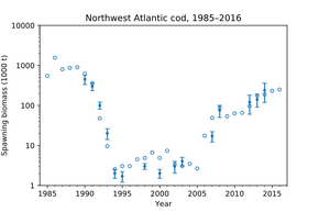 Fishing has had a devastating effect on marine organism populations for several centuries even before the explosion of destructive and highly effective fishing practices like trawling.[243] Humans are unique among predators in that they regularly prey on other adult apex predators, particularly in marine environments;[36] bluefin tuna, blue whales, North Atlantic right whales,[244] and over fifty species of sharks and rays are vulnerable to predation pressure from human fishing, in particular commercial fishing.[245] A 2016 study published in Science concludes that humans tend to hunt larger species, and this could disrupt ocean ecosystems for millions of years.[246] A 2020 study published in Science Advances found that around 18% of marine megafauna, including iconic species such as the Great white shark, are at risk of extinction from human pressures over the next century. In a worst-case scenario, 40% could go extinct over the same time period.[247] According to a 2021 study published in Nature, 71% of oceanic shark and ray populations have been destroyed by overfishing (the primary driver of ocean defaunation) from 1970 to 2018, and are nearing the "point of no return" as 24 of the 31 species are now threatened with extinction, with several being classified as critically endangered.[248][249][250] Almost two-thirds of sharks and rays around coral reefs are threatened with extinction from overfishing, with 14 of 134 species being critically endangered.[251]